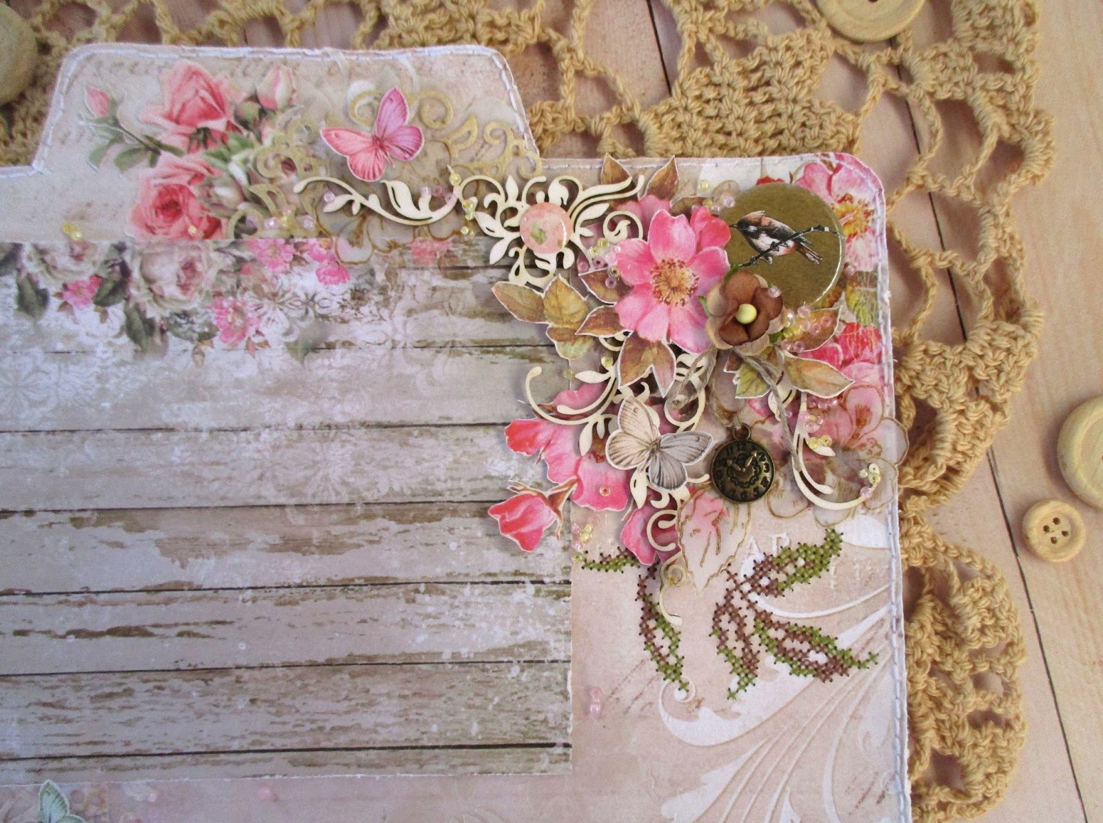 ОЭ этого этапа в моём развороте: шебби-лента, слово love и цветы: вырезанные, отштампованные, вязанные, бумажные объёмные.